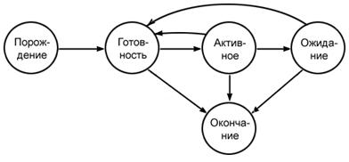 Процесс находится в каждом из своих допустимых состояний в течение некоторого времени, после чего переходит в какое-то другое допустимое состояние. Состав допустимых состояний, а также допустимые переходы из состояния в состояние обычно задают в форме графа существования процесса, пример которого изображен на рис. 2.1: