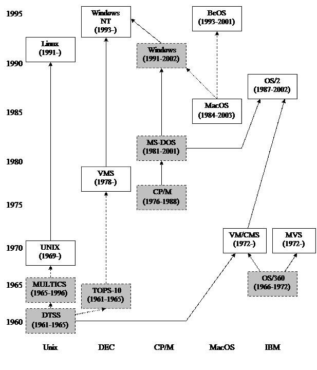 Отмеченные серым цветом операционные системы не являются системами разделения времени. Системы, названия которых обрамлены сплошными линиями, до сих пор существуют. Дата «рождения» представляет собой дату первой поставки, дата «смерти» – это дата, когда поставщик прекратил поставку системы.