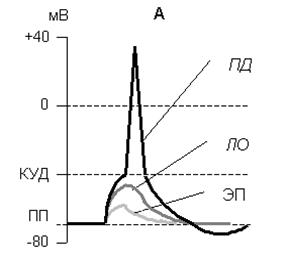| Рис. 4. Изменение мембранного потенциала при действии электрического тока разной силы ЭП - электротонический потенциал, ЛО – локальный ответ, ПД – потенциал действия. | возбуждения (сокращение, секреция и др.). Потенциал действия называют распространяющимся возбуждением, поскольку, возникнув в одном участке мембраны, он быстро распространяется во все стороны. Механизм развития ПД практически одинаков для всех возбудимых клеток. |