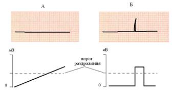 | Рис. 11. Кимограмма (сверху) и кривая скорости нарастания интенсивности раздражителя при плавном (А) и скачкообразном (Б) изменении его силы. | раздражителя и вклейте соответствующую ейй киммограмму в тетрадь 2. Объясните причину отсутствия сокращения в первом опыте и сделайте вывод о механизме аккомодации. | |