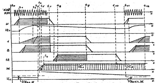 Принцип действия КАБ рассмотрим, пользуясь структурной схемой (рис. 1,б). Код из рельсовой цепи 5П поступает на приёмник Пр(и), в качестве которого применяются импульсные путевые реле типов ИМВШ-110 или ИВГ. Затем в дешифраторе автоблокировочном ДА осуществляется расшифровка принятого кода с зашитой от опасных отказов и управление сигнальными реле СР и шифратором кодов Ш. Схемотехнически ДА состоит из импульсного дешифратора ИД, кодового дешифратора КД и блока зашиты БЗ. В зависимости от принятого из РЦ 5П кода включаются сигнальные реле (Ж, 3) и комбинацией контактов этих реле схемой управления светофором СУС зажигается требуемое сигнальное показание, а шифратором Ш выбирается один из возможных кодов генератора Г (КПТ) и посредством передатчика П(т) (трансмиттерное реле T) посылается соответствующий код в РЦ 7П. Конструктивно ДА выполнен в виде трех блоков: БИ-ДА - блок исключений, БС-ДА - блок счетчиков, БК-ДА - блок конденсаторов. Блоком зашиты БЗ предусмотрены зашиты от кратковременного и длительного включения на путевом светофоре более разрешающего показания при воздействии помех или при отказах элементов схемы. К этим способам относятся: защита схемы при КЗИС; защита от одиночных импульсов, появляющихся в РЦ из-за помех тягового тока; защита от кратковременного включения на светофоре лампы зеленого огня при движении короткой подвижной единицы, а также зашита при отказе в ДА элементов не первого класса надёжности. Рассмотрим далее работу схемы сигнальной установки (рис.2) при движении поезда. При занятой подвижным составом РЦ 6П коды не поступают в аппаратуру сигнальной точки 5 (рис. 2), и поэтому в схеме выключены реле И, 1, B, 1A, Ж и З. Тыловыми контактами сигнального реле Ж в схеме СУС на светофоре 5 включается красный огонь, а шифратором Ш выбирается код КЖ для смежной РЦ 7П. После освобождения подвижным составом РЦ 5П на вход импульсного путевого реле И поступает код КЖ. Последовательность работы аппаратуры ДА при приеме второго и третьего цикла кода КЖ иллюстрируется временной диаграммой (рис. 3). При приеме импульса кода КЖ в момент времени t2 замыкается фронтовой контакт реле И, и в схеме ДА замыкаются следующие цепи: