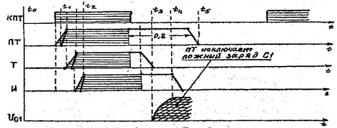 Следует отметить, что последовательным включением фронтового контакта И и тылового контакта ПТ (после момента времени t6) в цепи заряда конденсатора С1 проверяется асинхронное прохождение импульсов в смежных РЦ, что необходимо для контроля отсутствия KЗИС. Кроме того, включением реле В через тыловой контакт ПТ проверяется прием кодового импульса из собственной РЦ.