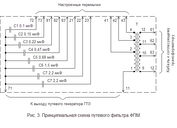 Входной сигнал от путевого генератора подаётся на выводы 11 – 71. Конденсаторы С1 – С8 совместно с обмоткой 4 – 1 трансформатора TV представляют собой последовательный резонансный контур, настраиваемый на нужную частоту внешними перемычками. При этом могут подключаться один или несколько конденсаторов параллельно и любая часть обмотки трансформатора. Одновременное изменение индуктивности и ёмкости контура фильтра при настройке позволяет достигнуть примерного равенства его сопротивления для различных частот. В результате нагрузка на генератор при любой частоте будет одинаковой, что обеспечивает независимость уровня его выходного сигнала от частоты. Выводы 12, 63, 62 и 61 используются для подключения кабеля, по которому сигнал через согласующий трансформатор и элементы защиты, размещённые в путевом ящике, подаётся в рельсовую линию. Выводы для подключения кабеля определяются в зависимости от рода тяги и минимального сопротивления балласта.