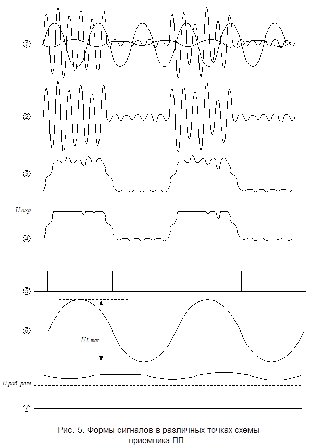 Примерные формы сигналов в различных точках схемы приёмника показаны на рис. 5.