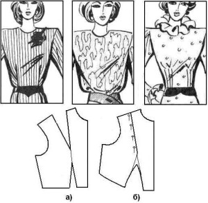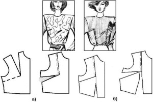 Для этого наносят линию предполагаемой вытачки на деталь переда от бокового среза к центру груди и разрезают по намеченной линии. Нагрудную вытачку из плечевого шва закрывают, совмещая срезы (рис.2,а).