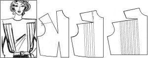 На уровне 1/3 высоты проймы на выкройке основы намечают линию подреза. Длина подреза не должна доходить до ширины горловины на 1см. Разрезают полочку по намеченной линии и закрывают нагрудную вытачку выше линии подреза, после чего откроется вытачка со стороны проймы, и нижний срез подреза удлинится для образования сборок (рис.10).