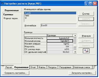 1.Выберите мышкой строчку EuroSIиз списка Имеющихся наборов единиц, чтобы сделать ее активной. В нашем примере для инженера удобнее всего было бы измерять расход газа в нормальных кубометрах в день. Поскольку для газов при нормальных условиях объемный расход прямо пропорционален мольному расходу, единицы измерения mЗ/d(кубометры в день) можно установить именно для мольного расхода. По умолчанию для мольного Расходаустановлена единица измерения kgmole/h.