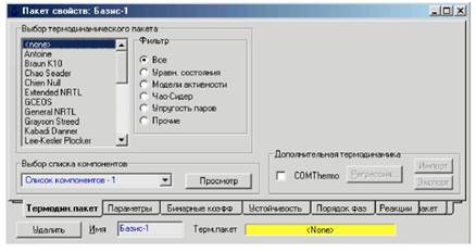 Специализированное окно состоит из нескольких закладок, позволяющих Вам задать всю информацию, необходимую для полного определения пакета свойств. В нашем примере будет использована только одна из этих закладок-Термодинамический пакет.