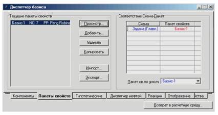 Обратите внимание, что в списке Текущие пакеты свойствтеперь присутствует определенный нами пакет свойств Базис-1. (Рис 1.10) Кроме того, рядом отображается информация о количестве компонентов (NC) и выбранном термодинамическом пакете (РР). По умолчанию вновь созданный пакет свойств поставлен в соответствие главной задаче, как показано в списке Соответствие Схема-Пакет. Теперь Вы можете начать задавать потоки и операции в расчетной среде Unisim.