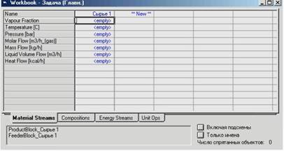 1.Чтобы создать поток, задайте имя потока (например, Сырье1) в строке, помеченной **New**на закладке Material Streams(Материальные потоки) в Рабочей тетради. Нажмите <Enter>и Unisim создаст поток с заданным именем.
