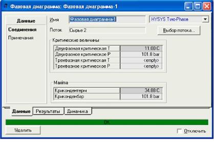 На закладке Соединенияспециализированного окна утилиты можно изменить имя утилиты, выбрать поток, связанный с утилитой, а также посмотреть критические параметры и максимальные значения на фазовой диаграмме -криконденбари крикондентерм. Имейте в виду, что утилита существует независимо от потока, в которому она присоединена; если, например, Вы удалите эту утилиту, то это никак не повлияет на поток Сырье2. И наоборот, если Вы удалите поток, утилита останется, но не будет содержать никаких данных, до тех пор, пока Вы не присоедините к ней новый поток, используя кнопку Выбор потока.... (Рис.1.23)