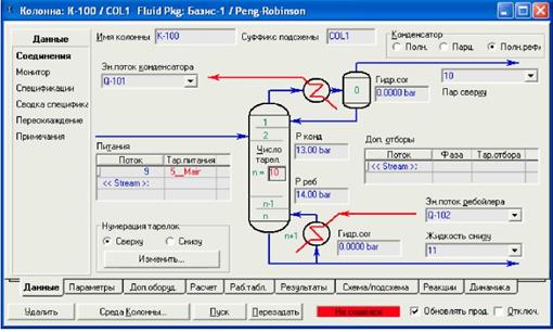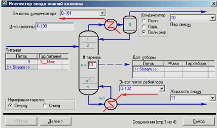 • Конденсатор и кипятильник колонны рассматриваются отдельно и не входят в заданное число тарелок колонны.
