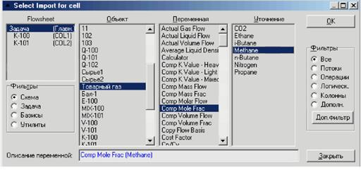 3.Выберите соответствующие значения в списках Объект, Переменнаяи Уточнение, как показано на рисунке ниже (мольная концентрация метана в потоке Товарный газ). Имейте в виду, что компоненты азот и СO2не будут участвовать в нашем расчете. Нажмите кнопку ОК.