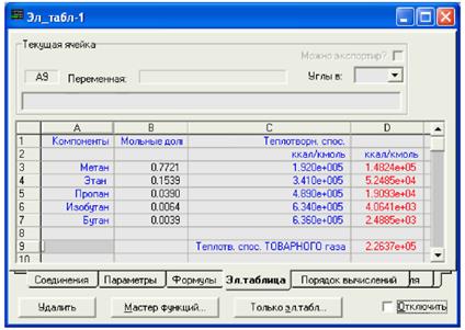 Теперь, в случае изменения состава потока Товарного газа, значения в соответствующих ячейках электронной таблицы будут изменены, а значение теплотворной способности смеси будет рассчитано заново.