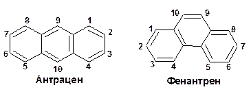 Наращиванием еще одного кольца из нафталина можно получить два изомерных углеводорода – антрацена и фенантрена: