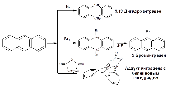 Антрацен легко присоединяет в положения 9 и 10 водород, бром и малеиновый ангидрид: