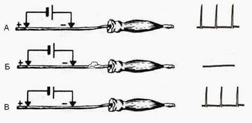 Затем нанесите на нерв между мышцей и раздражаемым участком каплю раствора новокаина. Через некоторое время вновь нанесите на нерв раздражающий импульс той же силы. Убедитесь, что сокращения мышцы при этом не возникает (Рис. 7Б).