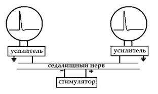 Рис. 9. Схема эксперимента демонстрирующая ► двустороннее проведение возбуждения по нерву