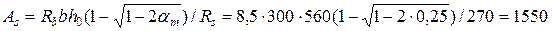 b = 200 мм, h = 600 мм; а = 65 мм; бетон класса В15 (Rb = 8,5 МПа); арматура класса А400 (Rs = 355 МПа); изгибающий момент М = 270 кН. м.