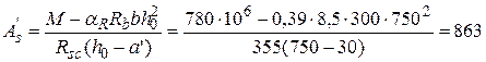 Пример 4. Дано: сечение размерами b= 300 мм, h = 800 мм; a = =50 мм; арматура класса А400 (Rs = Rsc = 355 МПа); изгибающий момент M = 780 кН.м; бетон класса В15 ( Rb = 8,5 МПа).