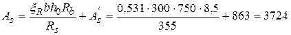 Принимая а¢ = 30 мм и xR = 0,531 (см. табл. 3.2) по формулам (3.24) и (3.25) определим необходимую площадь сечений сжатой и растянутой арматуры: