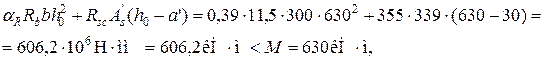 (0,7 . 0,39 + 0,3 . 0,464)11,5 . 300 . 6302 + 355 . 339 . 600 = 636,6 . 106 Н.мм = 636,6 кН. м > М = 630 кН.м, т.е. прочность обеспечена.