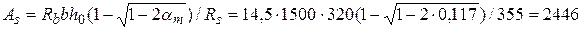Так как am = 0,173 < aR = 0,39 (см. табл. 3.2), необходимую площадь растянутой арматуры определяем по формуле (3.26)