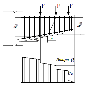 3.37. Для балок без отгибов высотой, равномерно увеличивающейся от опоры к пролету, рассчитываемых на действие равномерно распределенной нагрузки q, наклонное сечение проверяют из условия (3.44) при невыгоднейшем значении с, равном