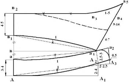 Отлетный срез.От точки в1 вверх по линии середины откладывают 4-5 см – ширину отлета и ставят точку в2: