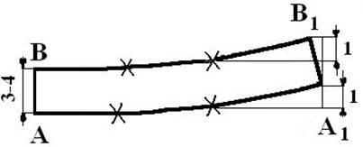 Передний край стойки можно поднять на 1 см. Для этого от точек А1и В1 вверх по вертикали откладывают по 1 см. Отрезки АА1 и ВВ1 делят на 3 части и правые точки деления попарно соединяют плавными кривыми с точками 1 см. Длину верхнего среза у середины переда сокращают на 0.5 см.