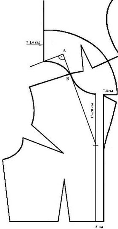 Линия втачивания в росток.На линии наклона воротника от точки В вверх откладывают отрезок, равный 1/3 мерки полуобхвата шеи, и ставят точку А: