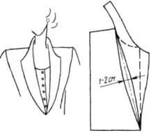 Если втачные воротники данного типа должны иметь углубленную, изогнутую горловину, линия горловины проводится на выкройке плавной кривой от точки начала отворота лацкана (или начала втачивания воротника) до верхней точки плечевого среза и горловины. Величина отклонения этой линии от прямой, соединяющей точки, обычно равна 1-2см. Линия втачивания воротника строится симметрично проведенной прямой, и ее углубление также равно 1-2см.
