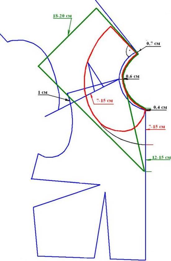 Построение выкройки начинают с определения линии втачивания воротника в горловину, которая имеет форму ее выреза. На листе бумаги обводят выкройку переда. По линии проймы откладывают вниз1 см и точку 1 см соединяют под линейку с высшей точкой горловины. К проведенной линии прикладывают плечевым срезом выкройку спинки, совмещая высшие точки ростка и горловины. Обводят верхнюю часть выкройки спинки (росток, плечевой срез, линию середины спинки на 15-20 см).