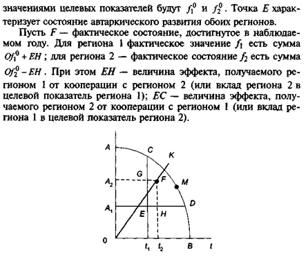 варианты с наибольшим выигрышем от экономического сотрудничества. Это и есть ядро двухрегиональной системы. Наконец, точка М соответствует экономическому равновесию (торговые или платежные балансы имеют нулевое сальдо в ценах равновесия). Все другие точки ядра CD соответствуют вариантам взаимовыгодного, но не эквивалентного обмена.