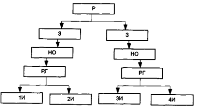Иерархическая пирамида «руководство — подчинение» демонстрирует (рис. 15.1) подчиненность исполнителей руководителям вплоть до высшего, где Р — руководитель, 3 — заместители, НО — начальники отделов, РГ — руководители групп, 1И—4И — исполнители.