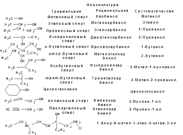 Для спиртов действуют тривиальная номенклатура, рациональная и систематическая. Рациональная номенклатура строится от метилового спирта или метанола, который в рациональной номенклатуре называется карбинол. Остальные спирты рассматриваются как производные карбинола, к которому присоединены различные радикалы. В систематической наличие гидроксильной группы обозначается суффиксом «ол». Суффикс ол добавляется к названию углеводорода: метан - метанол; этан – этанол и т.д. В иерархии функциональных групп гидрокси-группа обозначается после галоидов, углеводородных радикалов и кратных связей: