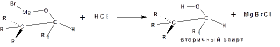 Образовавшийся броммагнийалкоголят подвергается гидролизу в кислой среде. При этом, в зависимости от природы радикалов R1 и R2, могут образовываться различные продукты.