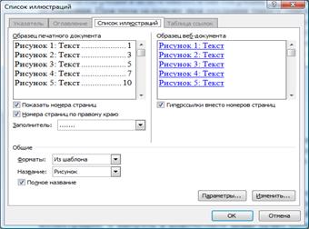 Для создания списка иллюстраций используется кнопкаСписок иллюстрацийгруппыНазвания.При этом задание параметров и оформление списка аналогично заданию оформления автоматического оглавления.