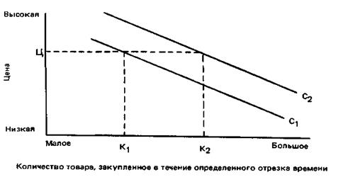 Экономисты установили, что под влиянием неценовых факторов происходит сдвиг кривой спроса, а не изменение ее формы. Предположим, что начальный уровень спроса представлен на рис. 61 кривой C1. Продавец запрашивает цену Ц и продает К1 штук товара. Предположим также, что положение экономики неожиданно улучшилось или продавец удвоил свой рекламный бюджет. Повысившийся в связи с этим уровень спроса отражается в виде сдвига вверх кривой спроса из положения С1 в положение С2. Но меняя цены, продавец стал теперь продавать К2 штук товара.