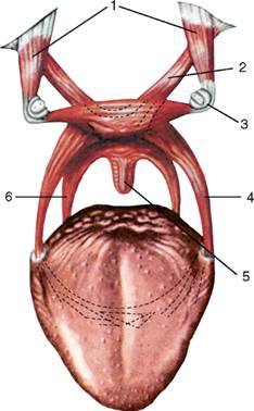 Выше нее по сторонам от средней линии лежат подбородочно-подъязычная и подбородочно-язычная мышцы, а также подъязычно-язычная мышца.