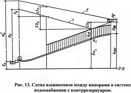 На рис. 13 показана связь между напорами в различных точках схемы водоснабжения с контррезервуаром для двух характерных случаев водопотребления: линия 1 – для максимального водопотребления и линия 2 – для «минимального транзита».