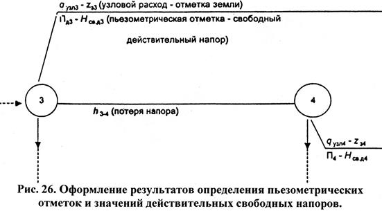 Вычисленные таким образом пьезометрические отметки и значения действительных свободных напоров указывают для всех узлов на расчетной схеме сети по форме, приведенной на рис. 26.