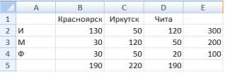 В столбце E подсчитано количество призеров по каждому городу, а в строке 5 – количество призеров по каждому предмету.