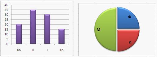 21. В телеконференции принимают участие преподаватели математики, физики и информатики. Преподаватели имеют разный уровень квалификации: без категории (БК), II, I, либо высшую (ВК) категорию. На диаграмме 1 отражено количество преподавателей с различным уровнем квалификации, а на диаграмме 2 – распределение преподавателей по предметам.