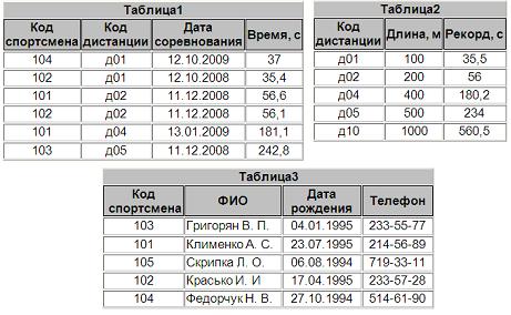 | таблицы 1 и 2 связаны через поля Время и Рекорд, таблицы 1 и 3 связаны через поля Код спортсмена | ||