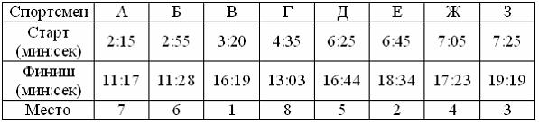 3. В соревнованиях по биатлону получен представленный таблицей протокол, в котором записано время старта и финиша спортсменов по секундомеру: