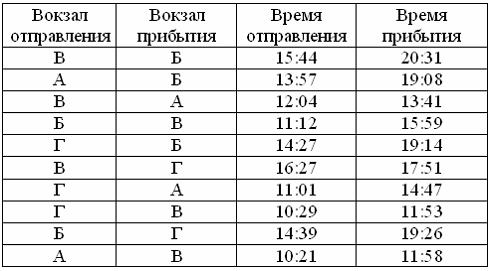 6. Приведен фрагмент расписания движения поездов между четырьмя городами, где имеются вокзалы, от которых поезда отправляются ежедневно:
