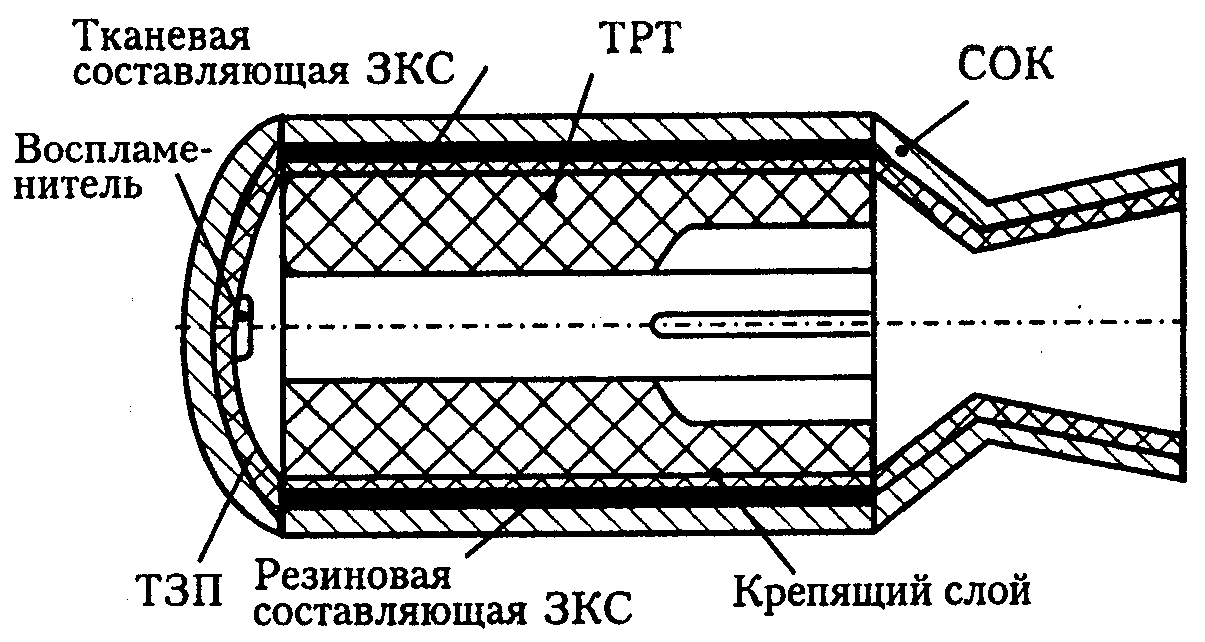 - заряд из СРТТ на основе полибутадиенового каучука имеет цилиндрическую форму с радиальными щелевыми пропилами и заполняет всю переднюю часть корпуса;