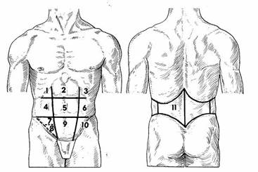 3 – левая подрёберная; 4 – правая боковая; 5 – околопупочная; 6 – левая боковая; 7 – правая подвздошно-паховая; 8 – паховый треугольник;
