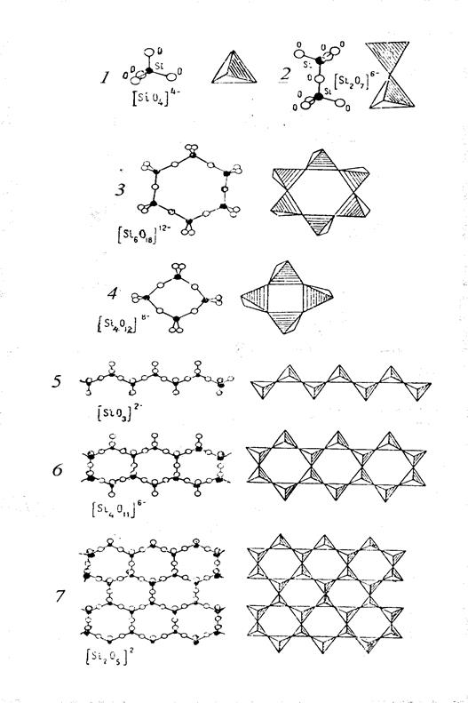 Кремнекислородные тетраэдры в кристаллической структуре силикатов либо находятся в виде изолированных друг от друга структурных единиц [SiO4]4–, либо сочленяются друг с другом в сложные комплексные анионные радикалы. При этом сочленение происходит только через углы тетраэдров, но не через ребра или грани. В зависимости от того, как происходит сочленение кремнекислотных тетраэдров, образуются различные формы анионных комплексных радикалов (рис. 10).